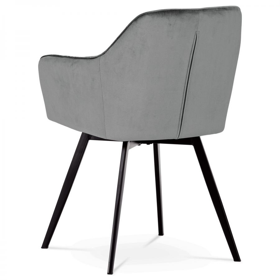 Díky svému dokonalému designu je tato jídelní židle šedá sametová látka, kovové nohy, černý matný lak DCH-425 GREY4 v industriálním stylu nezaměnitelná a zároveň velmi pohodlná. Skořepina sedáku a opěradla má potah z kvalitní látky v stříbřitě šedém matném sametu. Polstrování je z PU pěny. Velmi dekorativním prvkem je výrazné kosočtvercové prošití vnitřních ploch v barvě potahu a paspule po obvodu celé skořepiny. Vybraná látka se také velmi dobře čistí. Stabilitu židle zajišťují čtyři kónické kovové nohy obdélníkového průřezu s kvalitním práškovým nástřikem v černé matné barvě. Ukončené jsou černými plastovými kluzáky, zabraňující poškození tvrdých povrchů podlah. Tato provedení produkují z tohoto modelu židle skvělou volbu pro zařízení obývacích či jídelních, ale také zasedacích místností. Nosnost židle je 110 kg. Bonusem této židle je otočný a vratným mechanismus, který umožňuje otáčení o 90° doleva a o 90° doprava a zároveň vždy vrátí sedák do původní polohy. Díky němu žiidle zůstanou vždy srovnané u stolu.