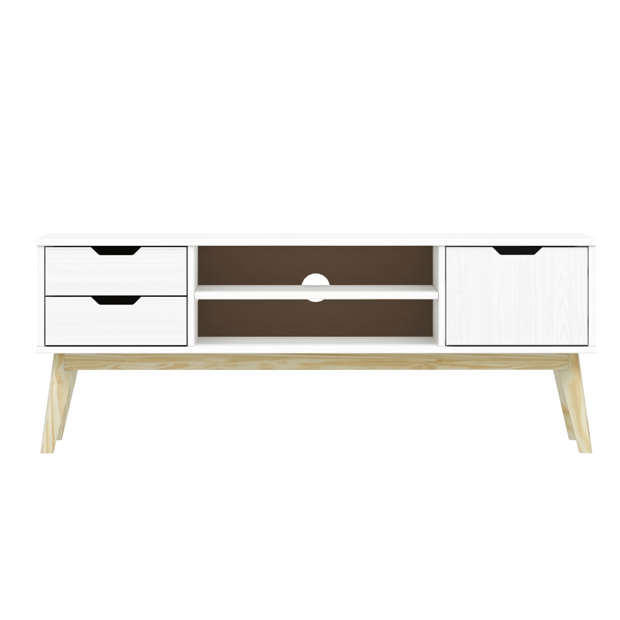 TV stolek bílý lak masiv borovice 1 dveře + 2 zásuvky BONITO, materiál masiv borovice, barevné provedení bílý lak 2 zásuvky s kovovými pojezdy, 1 dvířka, 1 police otvor na protažení kabelů