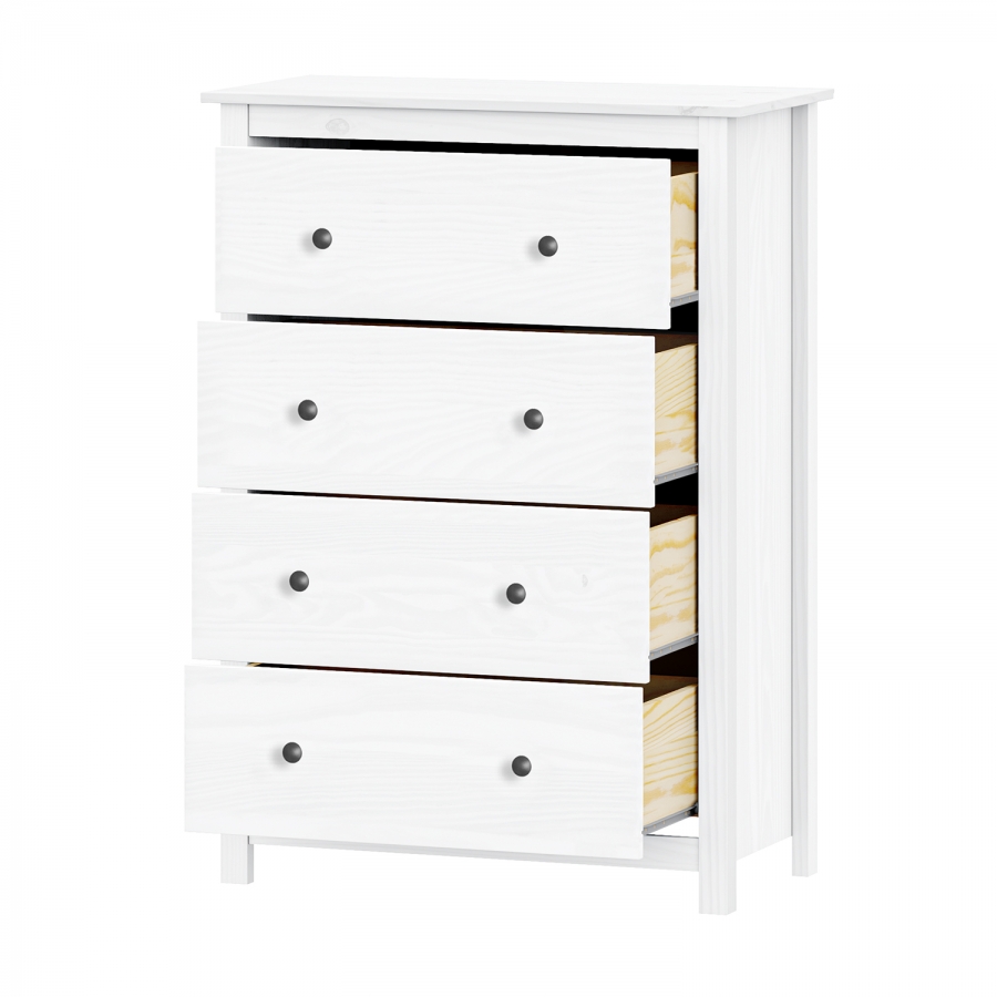 Komoda masiv borovice bílá 4 zásuvky TORINO , materiál masiv borovice, barevné provedení bílý lak kovové úchytky čtyři zásuvky s kovovými pojezdy