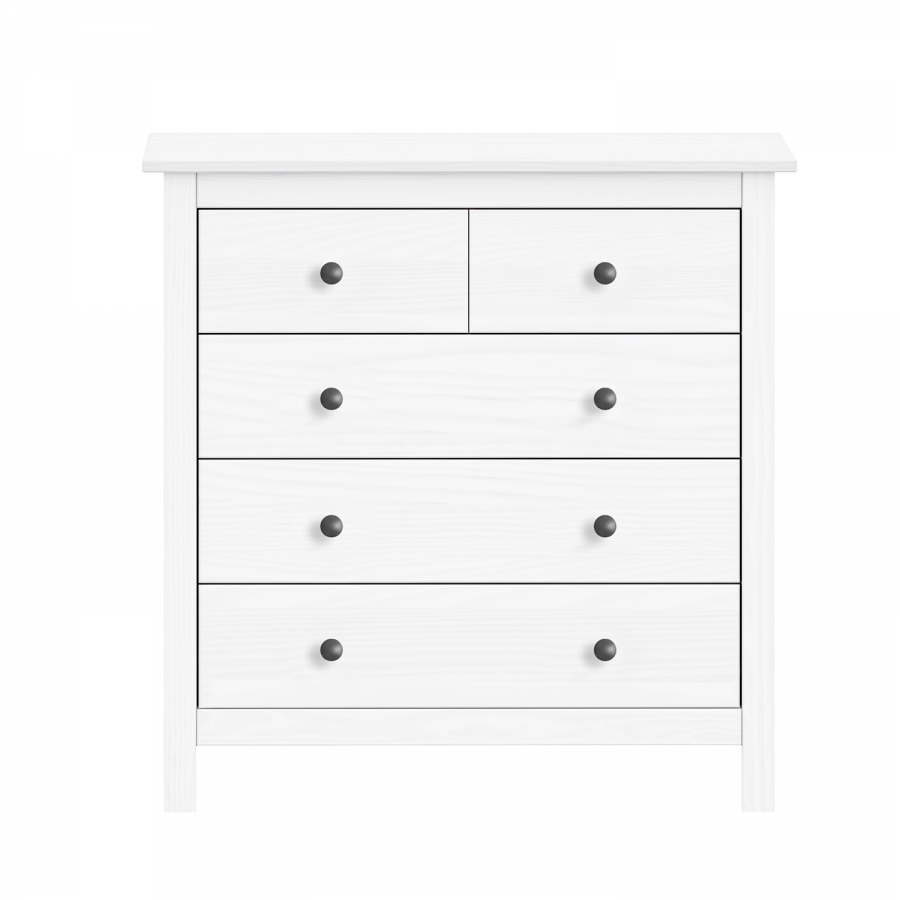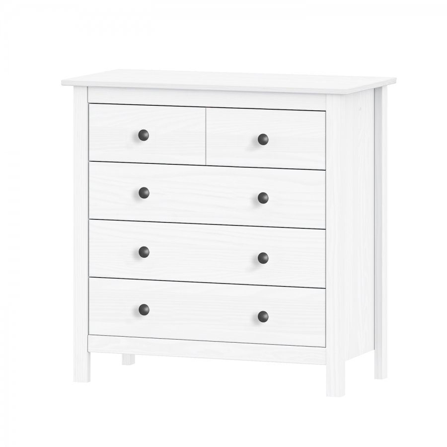 Komoda masiv borovice TORINO bílá kovové úchytky 8091BK, materiál masiv borovice, barevné provedení bílý lak kovové úchytky 2 menší a 3 větší zásuvky s kovovými pojezdy