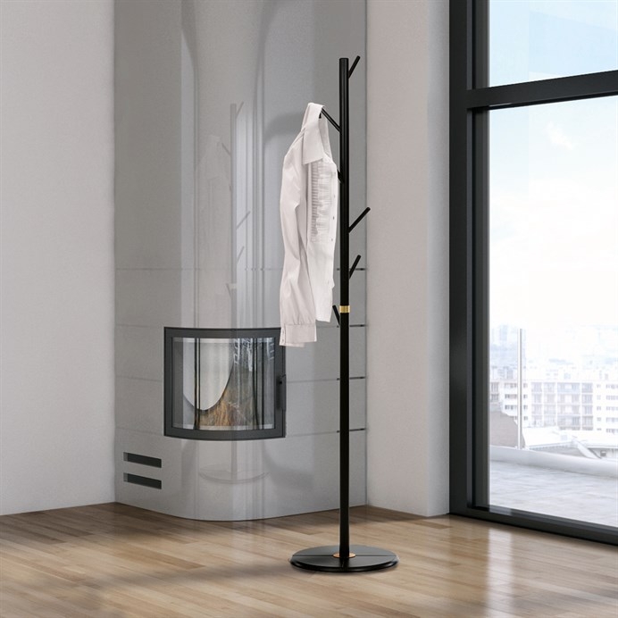 Tento elegantní černý stojanový věšák masiv bambus, černá + zlatá barva DR-N1006 BK přináší moderní styl do vaší předsíně. Vyroben z masivního materiálu, nabízí robustní a stabilní konstrukci pro zavěšení kabátů, klobouků a dalších doplňků. Zlaté detaily dodávají luxusní vzhled, který vynikne v každém interiéru.