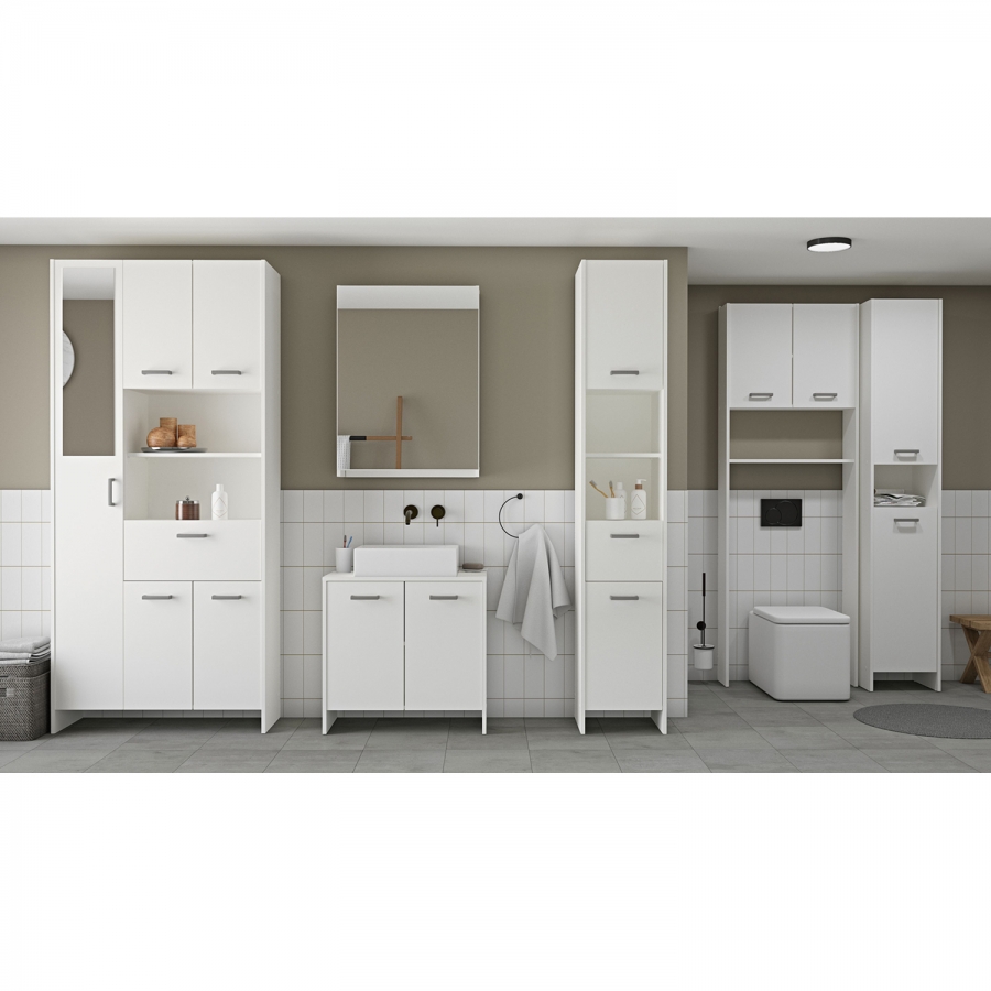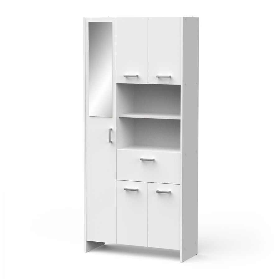 Vysoká skříňka do koupelny 1+4 dveře + 1 zásuvka bílá KORAL , barevné provedení bílá jedna zásuvka s kovovými pojezdy v pravé části se nachází dvě skříňky, každá s jednou policí v levé části vysoká skříňka se zrcadlem a čtyřmi policemi součást sestavy KORAL