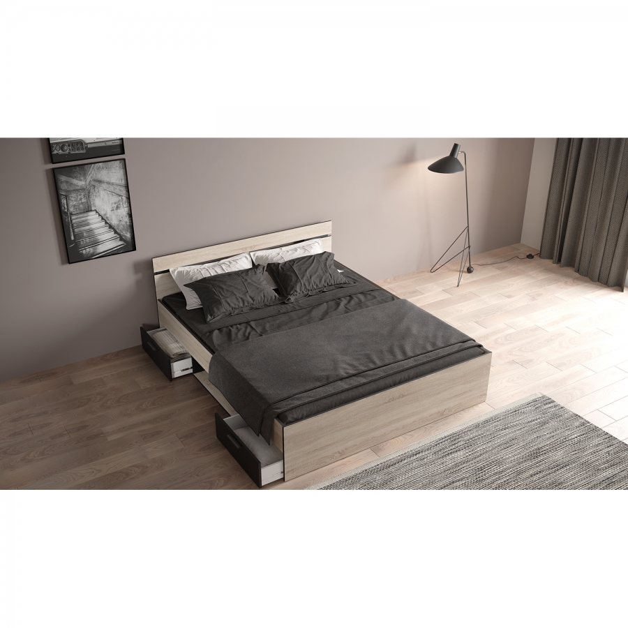 Postel s úložným prostorem 160x200 dub sonoma černá MICHIGAN , barevné provedení dub Sonoma / černá 2 úložné zásuvky s kovovými pojezdy, rozměr zásuvky (š/v/h) 56 × 11 × 33 cm rozměr niky (š/v/h) 80 × 20 × 36 cm, zásuvky a nika jsou v ceně matrace a rošt nejsou v ceně, doporučený rozměr matrace 160 × 200 cm nebo 2 kusy 80 × 200 cm k posteli je nutno použít samonosný rošt v rámu 160 × 200 cm (7155 nebo 7866 nebo 429596) doporučená maximální nosnost 2 × 100 kg