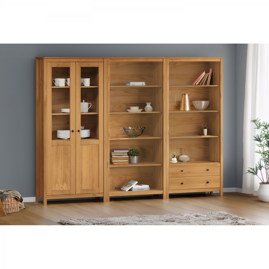 Sestava knihovny masiv borovice TORINO vosk, sestava knihoven TORINO 8070V a 8071V a vitríny TORINO 8072V materiál masiv borovice voskovaná v medovém odstínu kovové úchytky v barevném provedení černěná mosaz knihovna 8070V: čtyři police knihovna 8071V: tři police, dvě zásuvky s kovovými pojezdy vitrína 8072V: dvoje částečně prosklené dveře, čtyři police rozměr knihovny 8070V (š/h/v) 85 × 37 × 190 cm rozměr knihovny 8071V (š/h/v) 85 × 37 × 190 cm rozměr vitríny 8072V (š/h/v) 85 × 37 × 190 cm