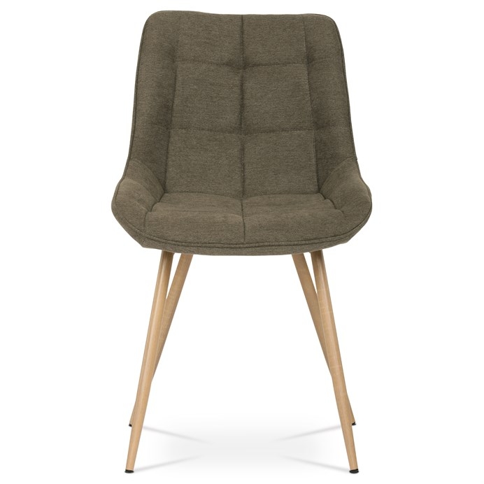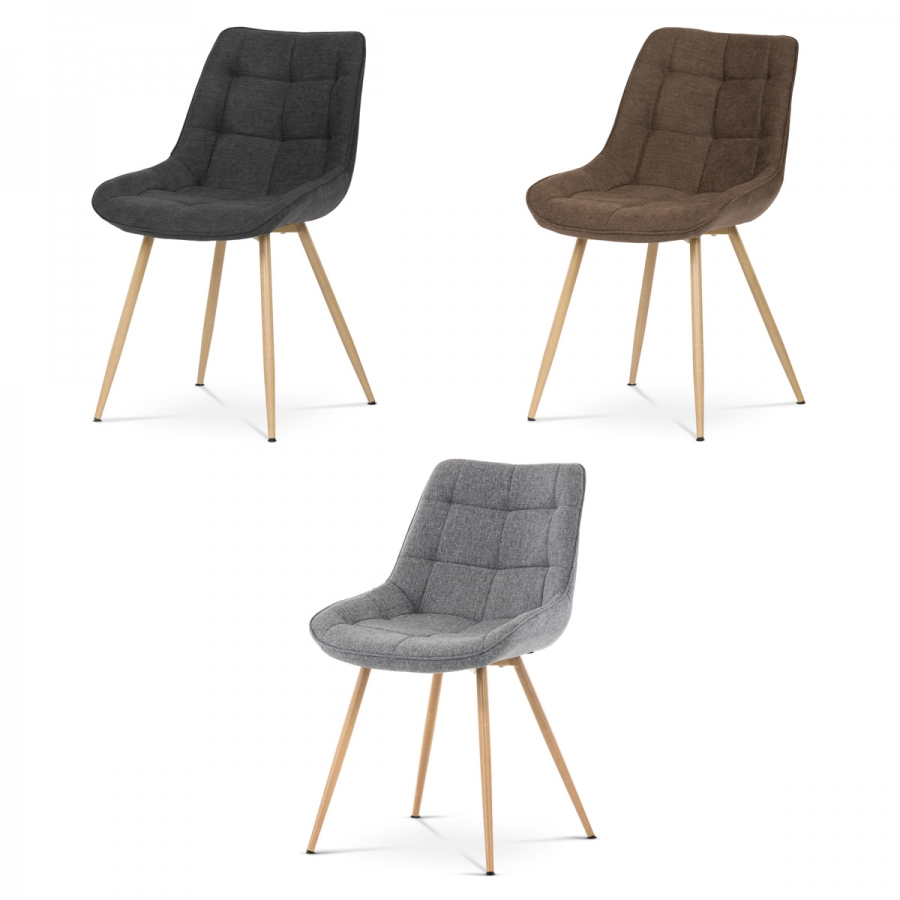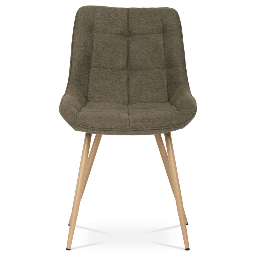 Designová skořepinová jídelní židle hnědá látka, kovové nohy, 3D dekor dub CT-394 BR2 je čalouněna hnědou látkou s výrazným prošitím sedací části i části určené k opření. Sedací část je zaoblená a má vyvýšené boky, plynule přecházející do opěráku. Polstrování je z kvalitní PU pěny. Čtyřnohá kovová podnož je v 3D dekoru dub. Nohy jsou kruhového průřezu a kónické, ukončené černými platovými kluzáky. Celá podnož je svařená a dodávána jako celek, nehrozí tedy občasné dotahování šroubů jako u podnože šroubované.Toto vše působí nejen jako stylový designový prvek, ale dělá židli velmi pevnou, pohodlnou a praktickou na kratší i delší posezení. Svým provedením ve Skandinávském stylu a decentní barevností se židle hodí nejen k jídelnímu stolu, ale i jako součást pracoven či konferenčních místností.