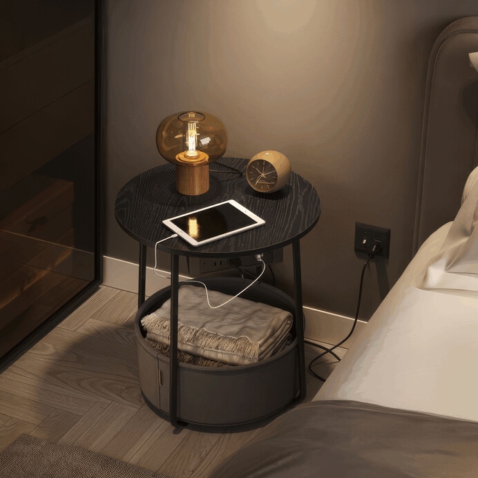 Kulatý odkládací kovový stolek 45x45x50 deska mdf černý AKF-E1028 BK kombinuje praktický design s moderními funkcemi. Kulatá deska o průměru 45 cm je vyrobena z MDF s černým dekorem, který snadno zapadne do různých interiérů. Stabilní kovové nohy zajišťují pevnou oporu, zatímco textilní koš pod deskou nabízí úložný prostor pro drobnosti. Součástí stolku je elektrická zásuvka se dvěma standardními výstupy a dvěma USB porty, které umožňují pohodlné nabíjení elektroniky přímo u stolu. Napájecí kabel je připevněn k rámu stolku, což usnadňuje organizaci prostoru a zabraňuje zamotání. Výška stolku je 50 cm, což jej činí vhodným jako přístavný nebo odkládací stolek v obývacím pokoji či pracovně.