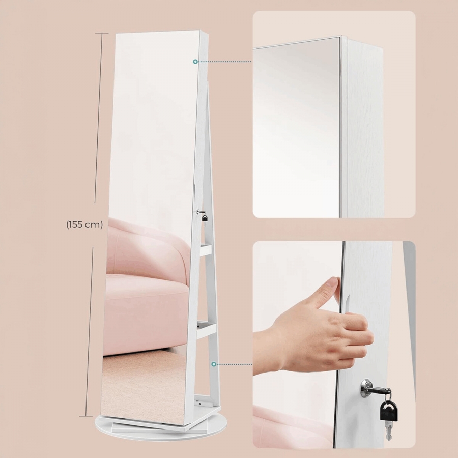 Zrcadlo mdf bílé AZR-E1207 WT ? Objevte praktické řešení pro uložení šperků i kosmetiky v elegantním provedení od značky Autronic. Tato volně stojící šperkovnice s celoplošným zrcadlem bez rámu nabízí moderní vzhled a chytré vnitřní uspořádání, díky kterému budete mít všechny své doplňky vždy přehledně po ruce. Uvnitř se nachází prostor pro desítky náušnic, prstenů, náhrdelníků, náramků, parfémů i kosmetiky. Vestavěné LED osvětlení se automaticky rozsvítí při otevření dveří a zajistí dobrý výhled i ve večerních hodinách bez nutnosti rozsvěcet hlavní světlo. Otočná základna o 360° umožňuje snadné natáčení skříně podle potřeby, zatímco zadní otevřené police poslouží k uložení dalších doplňků nebo dekorací. Konstrukce z kvalitního MDF materiálu a vnitřní sametová výstelka chrání vaše šperky před poškrábáním. Zámek s klíčem poskytne bezpečí i soukromí. Ideální doplněk do moderní ložnice, šatny nebo kosmetického koutku.