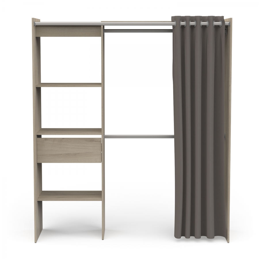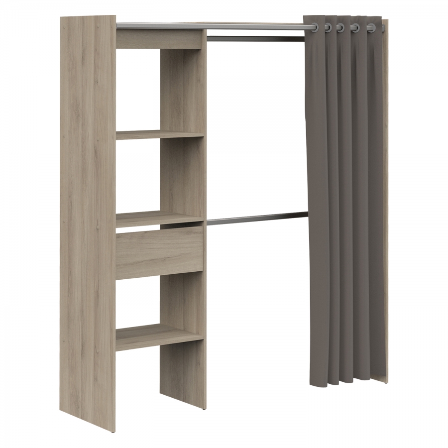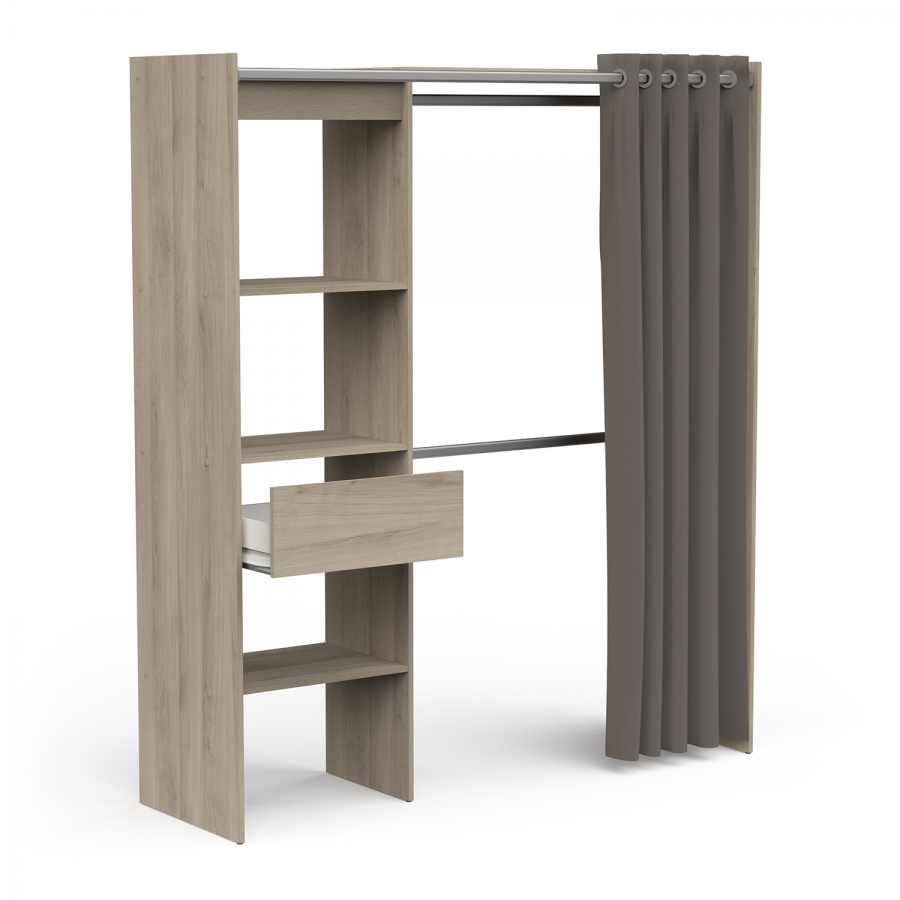 Úložný prostor skříň se závěsem dub CHICAGO , barevné provedení dub Kronberg, závěs materiál 100% bavlna šatní skříň, sestavitelná v šířce 114 až 168 cm lišta na závěs o délce 164 cm, 3 police o rozměru (š/h) 56 × 40 cm 1 zásuvka s kovovými pojezdy, rozměr zásuvky (š/h/v) 52 × 34 × 11 cm 2 kovové šatní tyče o délce 106 cm rozměr závěsu 203 × 190 cm, 12 otvorů pro zavěšení maximální nosnosti uvedeny v návodu k montáži