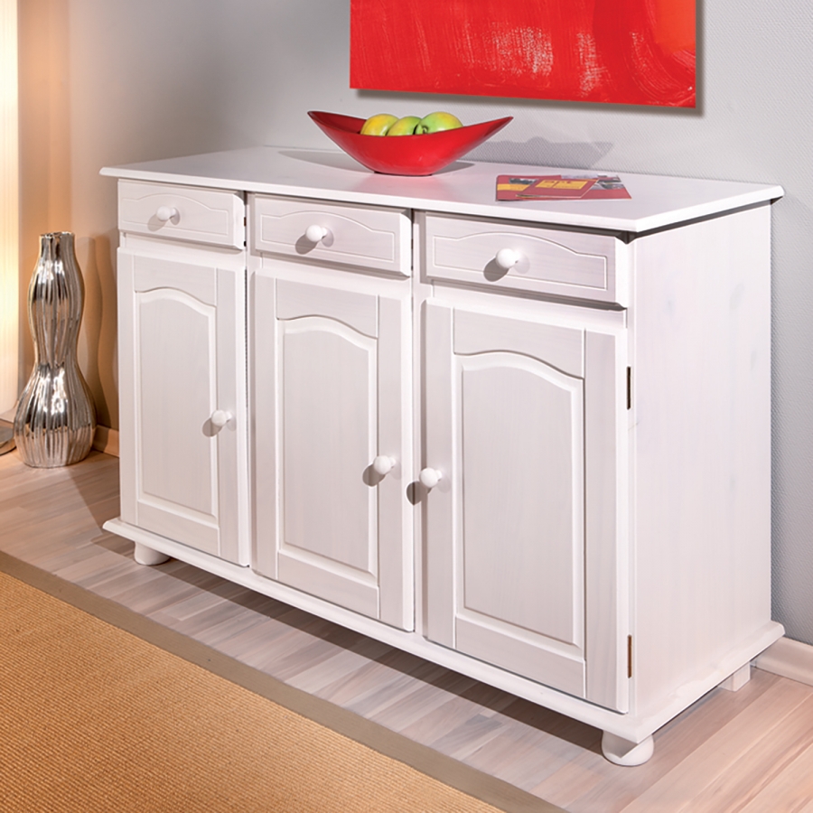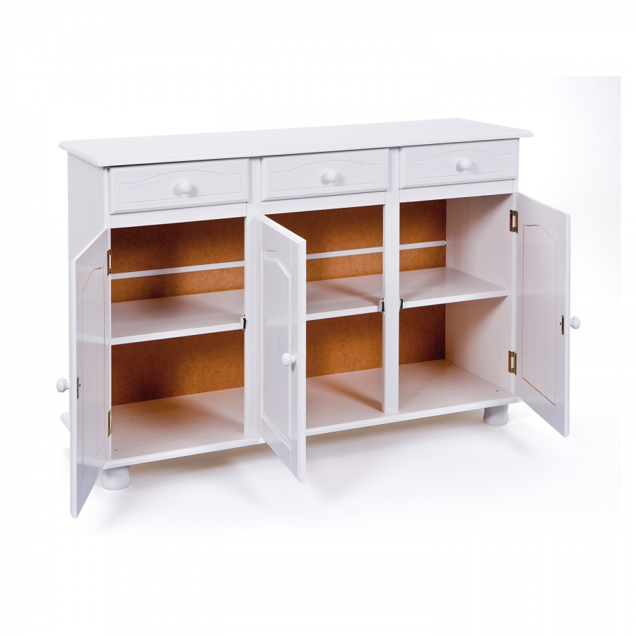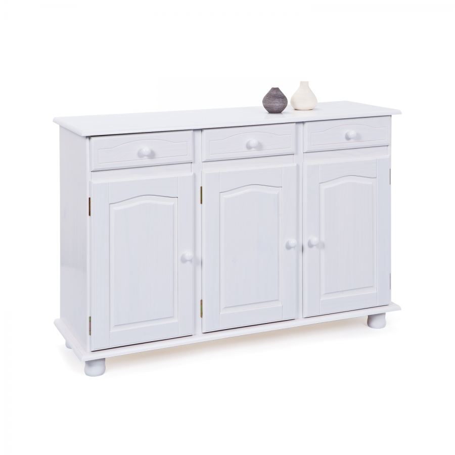 Komoda LIVIO ID20900810 z borovicového masivu, bílý lak; 3 malé zásuvky s kovovými pojezdy; troje dvířka, variabilní police; BALENO - KARTON: 1 ks (rozměry, š/v/d: 46 x 16 x 136 cm); Rozměry (šxhxv v cm): 130x43x87; Hmotnost v kg: 36
